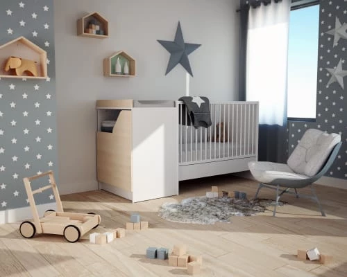Tous les éléments nécessaires à la transformation du cadre de lit bébé en cadre de lit junior sont fournies. Le sommier 90 x 190 cm n’est pas fourni.