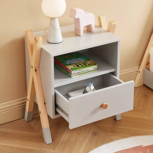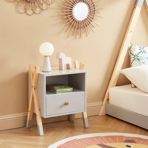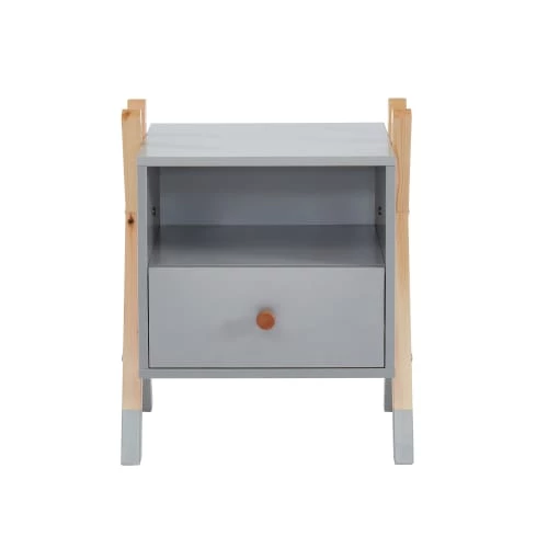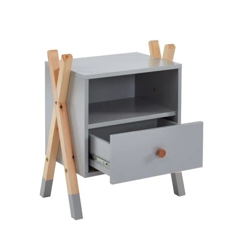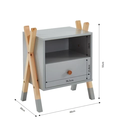 Table de chevet enfant TIPI gris – Structure en panneaux de particules et bois massif – Revêtement mélaminé – 1 tiroir – Dimensions : L46 x P30 x H55cm