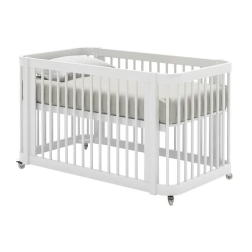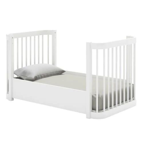 : Le lit bébé évolutif Maé accompagne bébé de la naissance à ses 3 ans. Ce lit possède 3 évolutions : berceau, lit à barreaux puis lit bas. Pratique, les 4 roulettes dont 2 à freins présents sur la version berceau et lit à barreaux permettent de déplacer bébé facilement sans perturber son sommeil. Le lit berceau possède un sommier à lattes réglable sur2 hauteurs. Ainsi, adaptez la hauteur au fur et à mesure de la croissance de votre enfant afin d’assurer sa sécurité. Réalisez la transition vers un lit de grand aisément grâce à la version lit bas. Le lit bébé évolutif est design et fonctionnel afin de s’adapter à de multiples styles de décoration. N’hésitez pas à compléter l’aménagement de la chambre de bébé avec la commode 4 tiroirs et l’étagère de la même collection. Caractéristiques : Composition : StructurePanneaux de fibres & Bois Pin massif. Sommier à lattes inclus 2 positions de sommier Couleur : Blanc *Matelas non inclus À monter soi-même. Données techniques Version Berceau, matelas 69x55x10 cm inclus : Long. 62 x larg. 78,6 x h. 79,9 – Dim int. 70,2×57 cm – Hauteur de couchage principale 45,9 cm Version lit à barreaux 70×140 cm : Sommier à lattes réglable sur 3 hauteurs 48,9 – 31,9 – 13,7 cm Long. 145 x larg. 78,6 x h. 79,9 – Dim int. 70×140 Matelas non inclus *Épaisseur maximale matelas 10 cm Version lit bas Long. 145 x larg. 78,6 x h. 74 cm – Dim int. 70×140 cm Long. 145 x larg. 78,6 x haut. 79,9 cm 3 colis – Poids total 39 kgLivraison en rez-de-chaussée du Lundi au Vendredi, de 9H00 à 16H00.