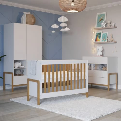 Le lit bébé 60×120 de la gamme Victor, signé par la marque Kocot Kids, propose un style scandinave affirmé, pour une chambre bébé douce. Marque : Kocot Kids – Fabrication Européenne – Matériaux : Panneaux de particules – Panneaux MDF – Pieds en bois de chêne massif – Couleur : Blanc et bois de chêne massif – Caractéristiques : Lit bébé : Sommier en panneaux perforés Inclus – Réglable en 3 hauteurs – Barreaux amovibles – Poids maximum conseillé : 70 kg – Hauteur du matelas conseillé : 13 cm – Poids et dimensions : Lit bébé : 38 kg – 66 x 130 x 89 cm – Couchage : 60 x 120 cm – Conditionnement : Produit livré avec sommier et sans matelas à monter, avec notice incluse. – Produit Kocot Kids garanti 12 Mois. – Matelas vendu séparément