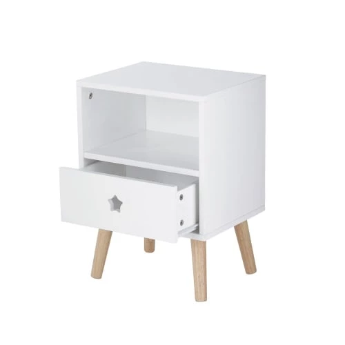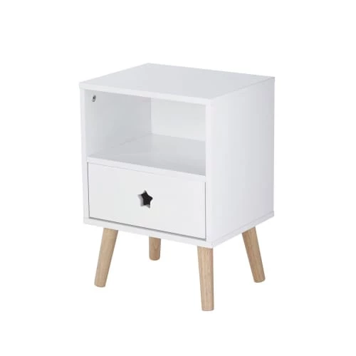 La table de chevet enfant blanche DREAMS accompagnera votre enfant lors de ses douces nuits. On craque pour ses pieds obliques qui insufflent un style légèrement vintage, et pour ses lignes contemporaines. Côté rangement, vous serez ravi : 1 tiroir et 1 niche viennent compléter la structure, et garderont précieusement les livres de votre enfant et tous ses petits trésors. Le plateau accueillera la veilleuse ou la lampe de chevet, ainsi que son réveil. Et que dire de cette petite touche étoilée. On ne peut que craquer pour cette table de nuit !