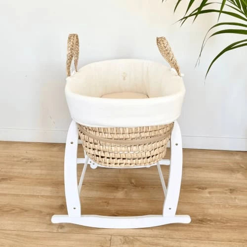 Le support de couffin conçu par Clair de Lune crée un doux mouvement de va-et-vient qui permet d’apaiser bébé et l’aide à s’endormir.