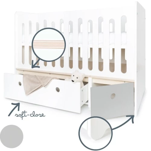 Le lit bébé évolutif COLORFLEX est équipé d’un tiroir avec le système de fermeture “Soft Close” (doux et silencieux) et d”une petite niche de rangement, idéale pour les accessoires de votre bébé.