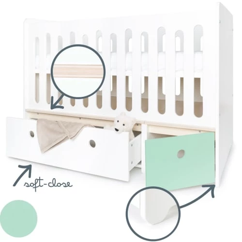 Le lit bébé évolutif COLORFLEX est équipé d’un tiroir avec le système de fermeture “Soft Close” (doux et silencieux) et d”une petite niche de rangement, idéale pour les accessoires de votre bébé.