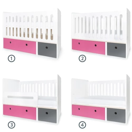 Le lit bébé évolutif COLORFLEX est ergonomique : la hauteur du sommier se règle sur 2 hauteurs (63 puis 33 cm). Ensuite, à gauche ou à droite du lit, la grande barrière peut être remplacée par une plus petite : votre enfant peut sortir seul de son lit, une grande étape dans sa vie de grand !