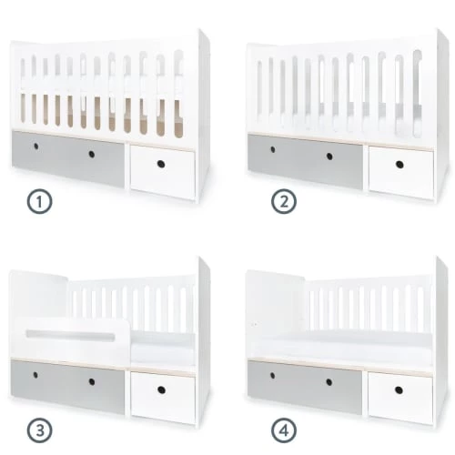Parfait dès la naissance, il peut se transformer progressivement en lit d’enfant.