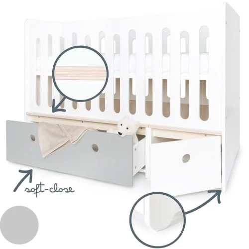Le lit bébé évolutif COLORFLEX est équipé d’un tiroir avec le système de fermeture “Soft Close” (doux et silencieux) et d”une petite niche de rangement, idéale pour les accessoires de votre bébé.