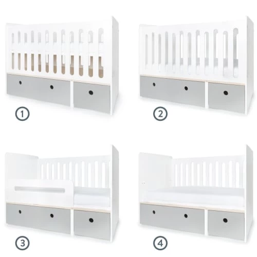 Parfait dès la naissance, il peut se transformer progressivement en lit d’enfant.