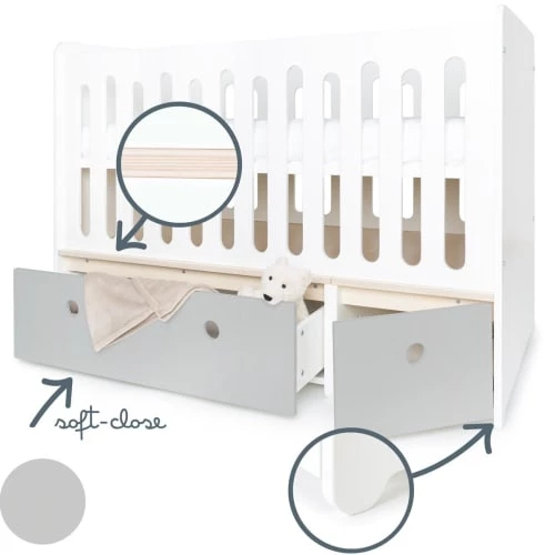 Le lit bébé évolutif COLORFLEX est équipé d’un tiroir avec le système de fermeture “Soft Close” (doux et silencieux) et d”une petite niche de rangement, idéale pour les accessoires de votre bébé.